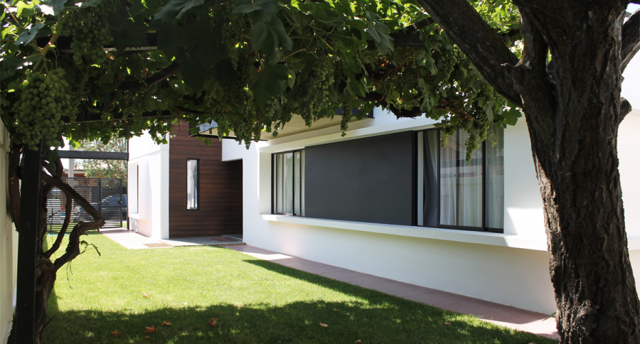 La casa existente contaba con una distribución rectangular en el primer piso de 15 x 7.5 m, la cual se mantuvo y se aumentó la altura de piso a cielo de 2.2 a 2.6 m. Se dispuso en un nuevo segundo piso el dormitorio principal, los espacios para el ocio y una doble altura para el living, así otorgamos mayor amplitud y luminosidad al primer nivel.